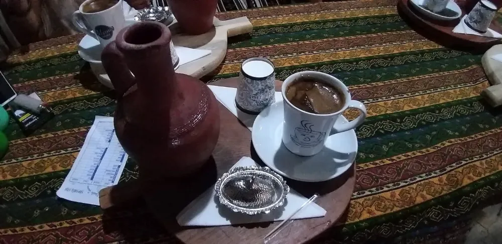 Her defasında büyük bir merakla gittiğim Memişin Çörekotu kahvesine gittim. Memiş bey buraya kültür kahvesi diyor. Toprak testi, toprak bardakta buz gibi su, koca kupada çörekotu kahvesi lokum ile birlikte tahta senit ( biz yassiağaç deriz) üzerinde sunuluyor . Adeta görsel bir şölen.