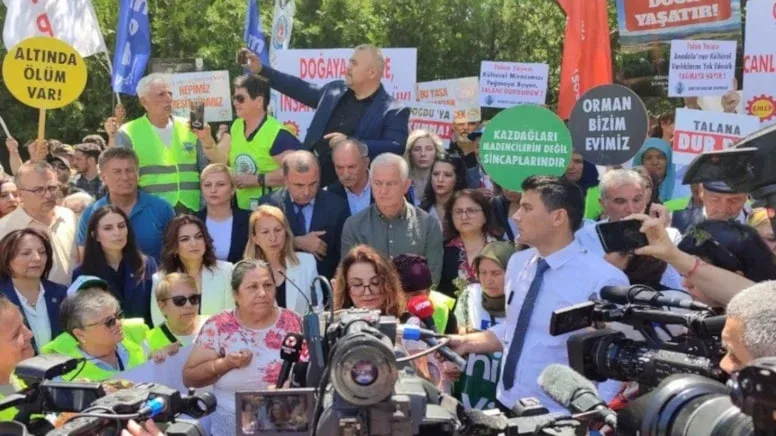 Ülkenin dört bir yanından gelen köylüler, çiftçiler ve çevreciler, zeytinlikleri madencilik faaliyetine açması öngörülen kanun teklifini, TBMM Dikmen Kapısı önünde protesto etti. Vatandaşlar, ellerinde Türk bayraklarının yanı sıra “Talana dur de”, “Havama, toprağıma, suyuma dokunma” yazılı dövizler taşıdı.
