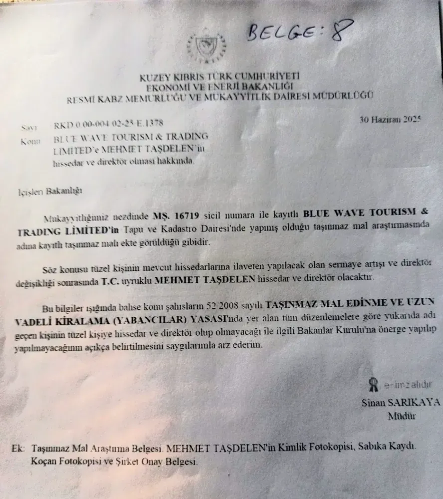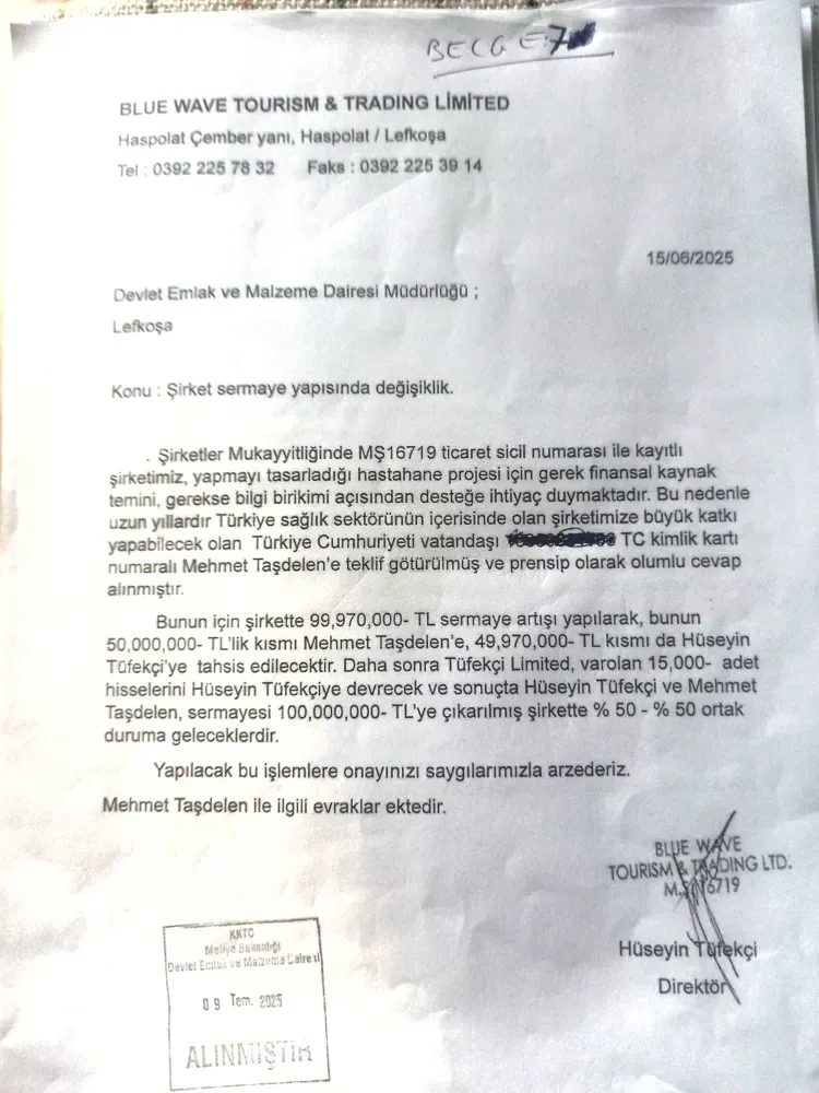 Nitekim, 15 Haziran 2025'e geldiğimizde, Tüfekçi, Devlet Emlak ve Malzeme Dairesi'ne bir yazı yazarak, sahibi olduğu 2 milyon TL sermayeli Blue Wave Tourism & Trade Ltd. adlı şirketinin yüzde 50 hissesini 50 milyon TL'ye TC vatandaşı, Gaziantepli iş adamı Mehmet TAŞDELEN adlı işadamına satmak için izin istedi.(BELGE:7)