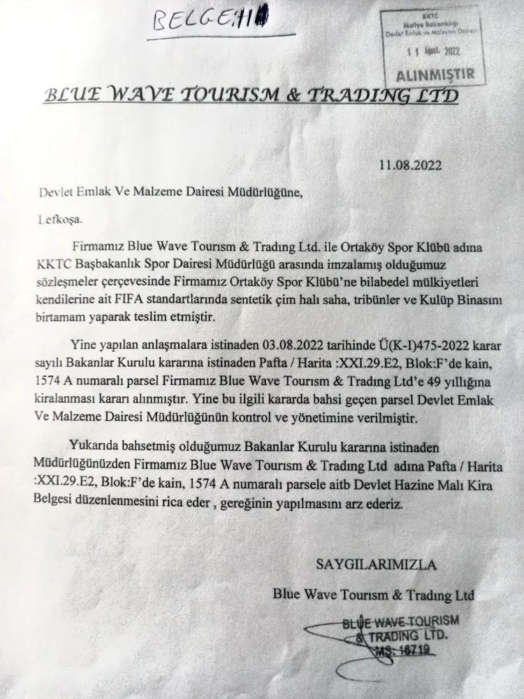 Başbakan Ünal Üstel'in isteği üzerine onaylanan önergeye göre Ü(K-I) 917-2022 sayılı ve 7 Ekim 2022 sayılı karara göre, "1574 A" Parselinin BLUE WAVE TOURİSM & TRADİNG LTD"E 49 yıllığına yılda 1 Dolara kiralanması, arazi üzerine " DÜKKAN, ÜREMEYE YARDIM VE KÖK HÜCRE MERKEZİ İNŞA EDİLMESİ" ve gerekli sözleşmenin imzalanması için hazine arazisinin Spor Dairesi Müdürlüğü’nden alınarak Devlet Emlak ve Malzeme Dairesi Müdürlüğü’ne verilmesi" kararlaştırıldı. ( BELGE : 4)