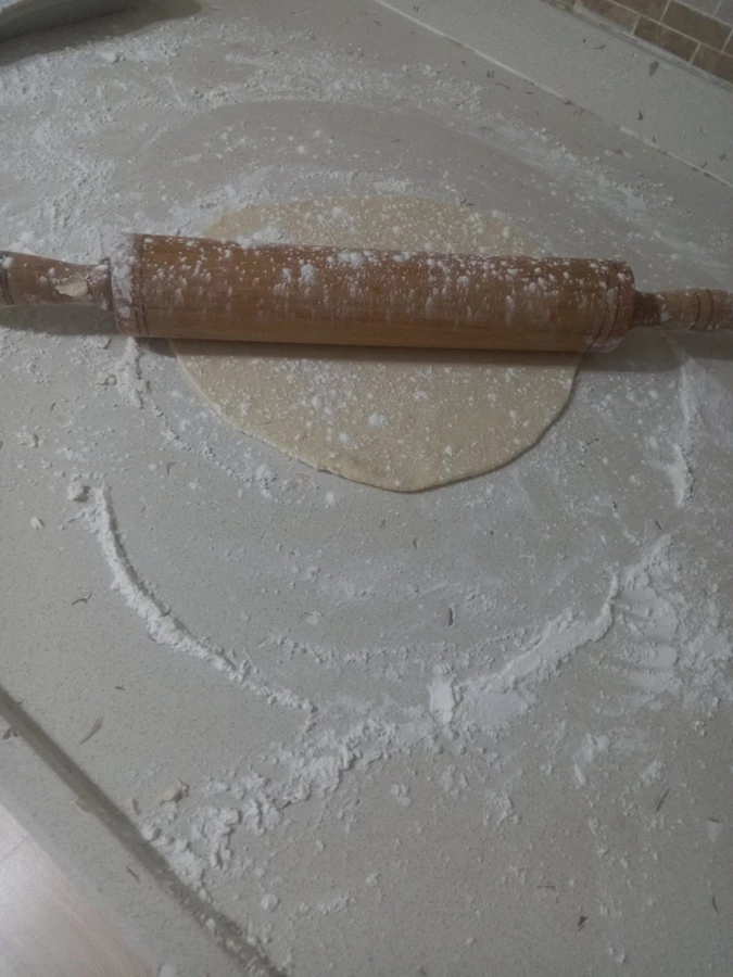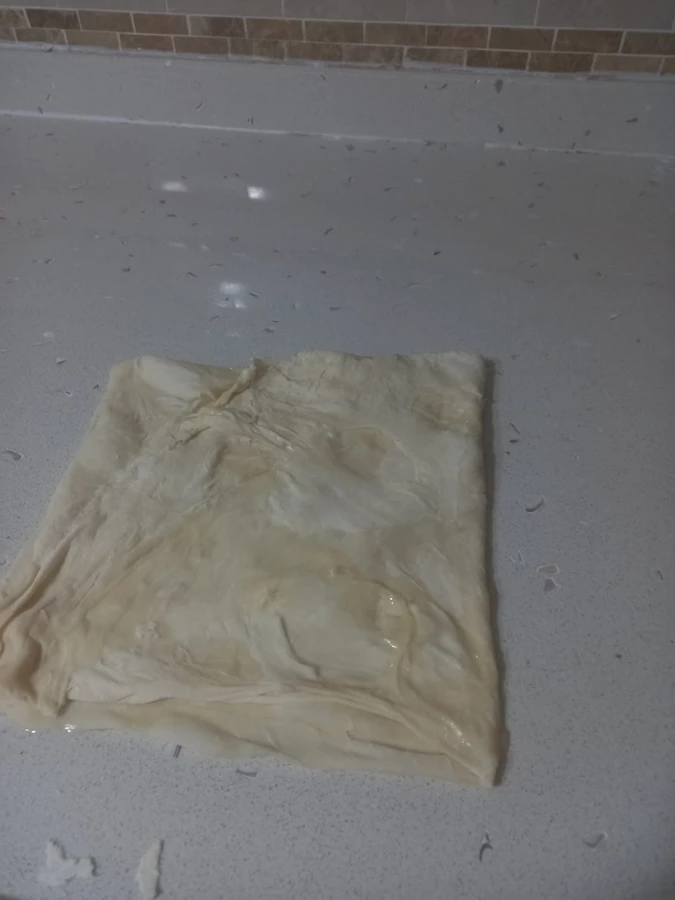 Üzerini Streçle Kapatıp Temiz Bir Bez Örtelim Ve en fazla bir saat kadar Mayalanmasını bekleyelim mayalanan hamurumuzu 6 Eşit Parçaya Bölerek Beze Yapalım. Yaptığımız bezeleri 10 dk daha dinlendirip her bir bezeyi merdane yardımı ile tabak büyüklüğünde açıp bir kenarda bekletelim. Her bir küntü (beze) daha sonra oklava yardımı ile yufkaların üzerine nişasta dökerek ince bir yufka elde edene kadar güzelce açalım, açtığımız yufkaların üzerine sıvı yağı serpip yufkamız kare şekli olana kadar sağlı sollu katlayalım. Her katlamada yufka aralarına yarım yemek kasığı kadar yağ serpiştirmeyi unutmayalım.