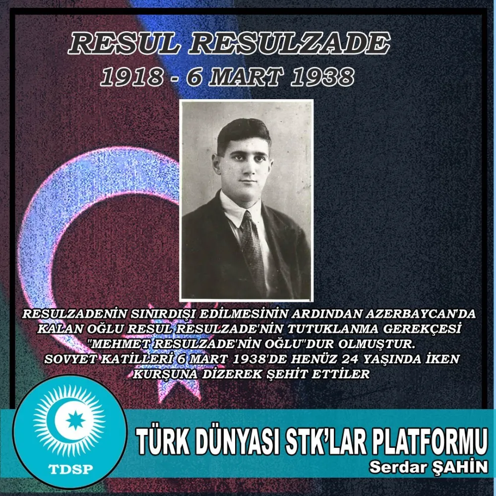Sovyet hükümeti, M.A. Rasulzade'nin en büyük oğlu Rasul Rasulzade'nin henüz 19 yaşındayken öldürülmesini emretti. Hiçbir suç işlememiş, suç işlememiş, M.A. Rasulzade'nin oğlu olmaktan başka bir şey çalmamış 19 yaşında bir gencin vurularak öldürüldüğünü düşünün. Resul Resulzadeh, 5-6 Mart 1938 gecesi NKVD'nin "Üçlüsü" tarafından vurularak öldürüldü.