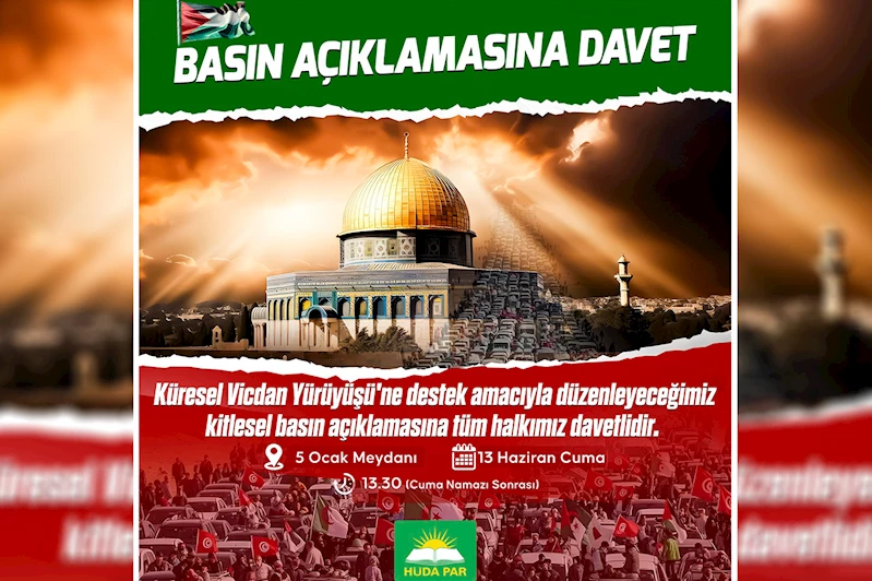 HÜDA PAR Adana İl Başkanlığı'ndan yapılan açıklamada, “Mazlum Filistin halkının yanında olduğumuzu göstermek ve küresel vicdan çağrısına destek vermek amacıyla düzenleyeceğimiz basın açıklamasına tüm halkımız davetlidir.” ifadelerine yer verildi.