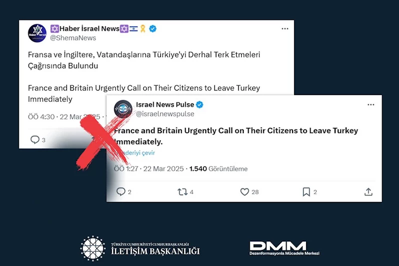 DMM'nin sosyal medya hesabından yapılan açıklamada, "israilin propaganda hesaplarından paylaşılan, 'Fransa ve İngiltere, vatandaşlarına Türkiye'yi derhal terk etmeleri çağrısında bulundu' iddiası doğru değildir." denildi.