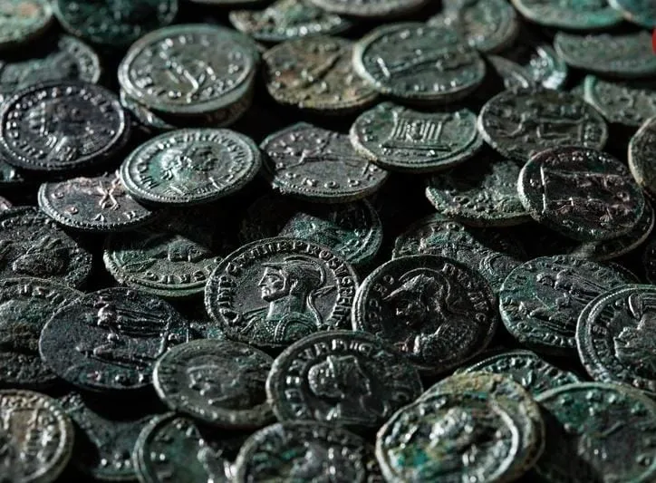 Kazıların sonucunda beklentilerin çok ötesinde bir bulgu ortaya çıktı: Küçük bir alanda toplam 15 kilogram ağırlığında, 4100’den fazla Roma sikkesi bulundu. Bulgular, bu sikkelerin zamanla çürümüş deri veya kumaş keseler içinde gömüldüğünü gösteriyor.