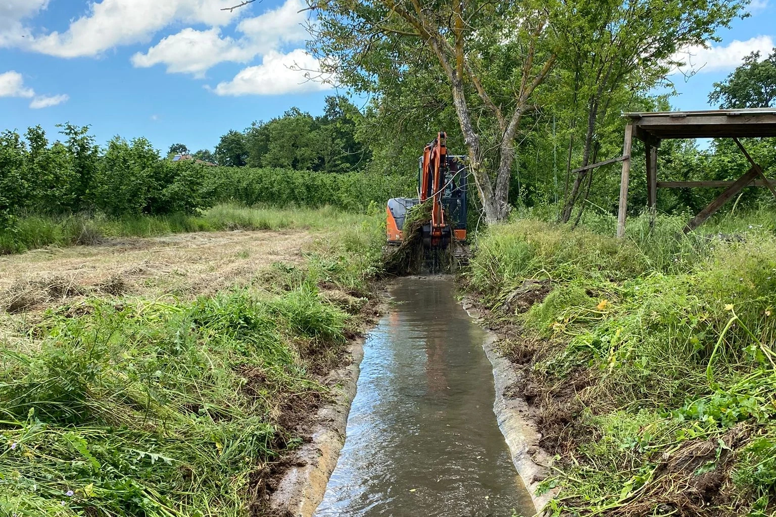 Kocaeli Büyükşehir Belediyesi ekipleri, tarlalara suyun kesintisiz ulaşması için kanal içindeki toprak, taş ve yabani otları temizliyor.