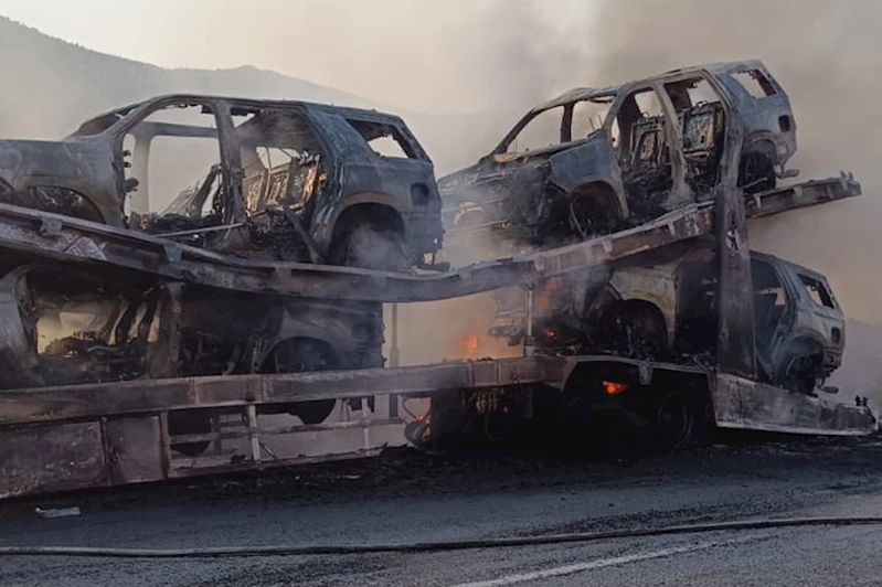 Sürücüsü ve plakası henüz öğrenilemeyen lüks araç yüklü tır, henüz bilinmeyen bir nedenle alev aldı.