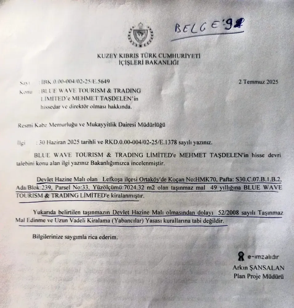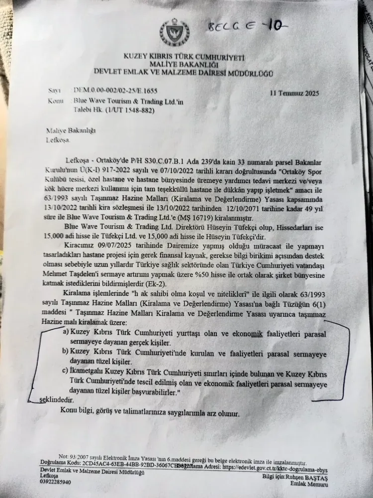 Nitekim, 15 Haziran 2025'e geldiğimizde, Tüfekçi, Devlet Emlak ve Malzeme Dairesi'ne bir yazı yazarak, sahibi olduğu 2 milyon TL sermayeli Blue Wave Tourism & Trade Ltd. adlı şirketinin yüzde 50 hissesini 50 milyon TL'ye TC vatandaşı, Gaziantepli iş adamı Mehmet TAŞDELEN adlı işadamına satmak için izin istedi.(BELGE:7)