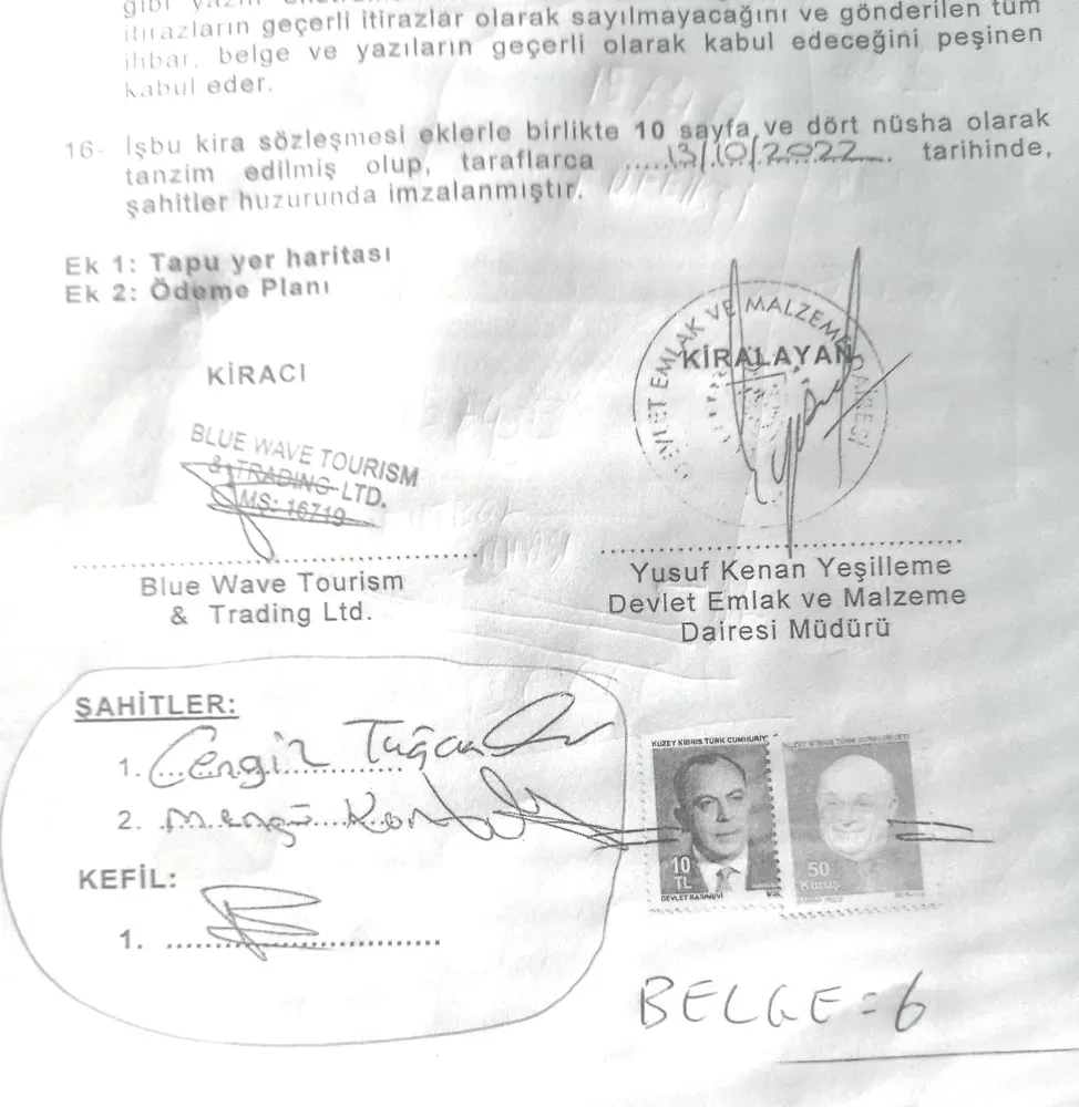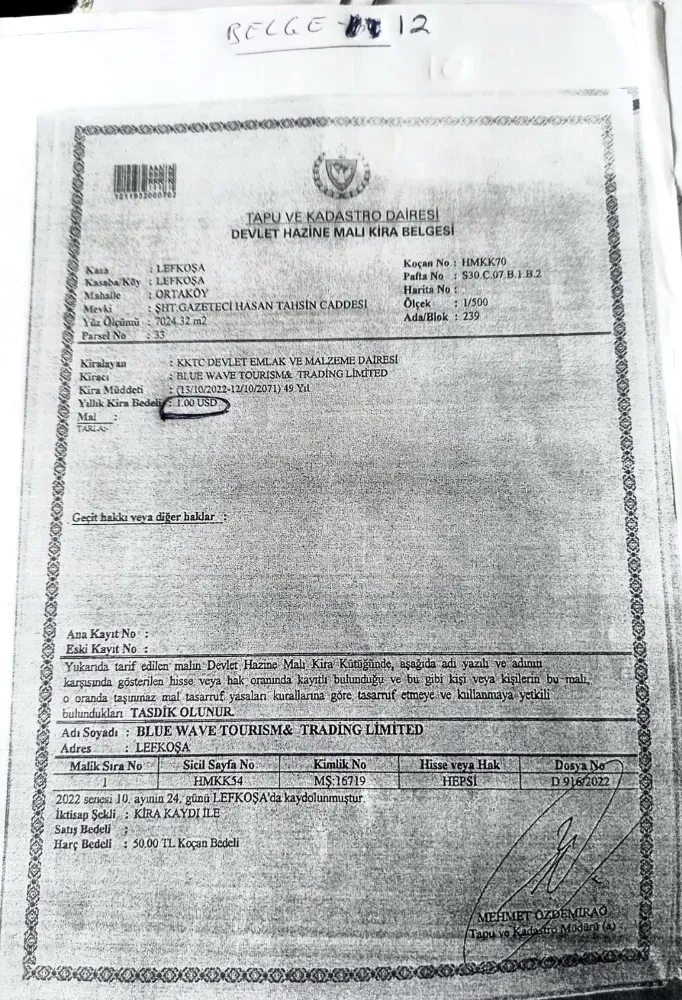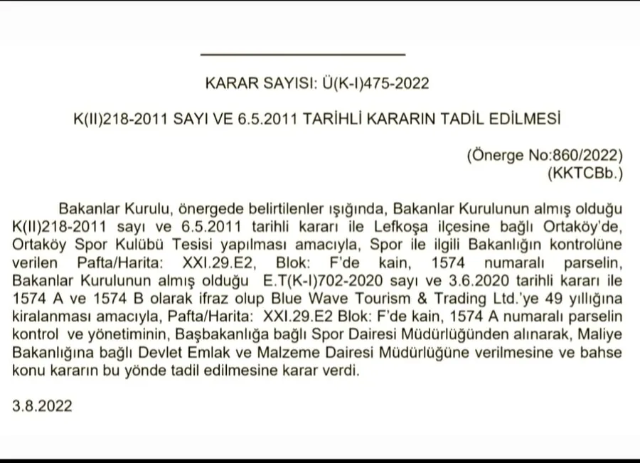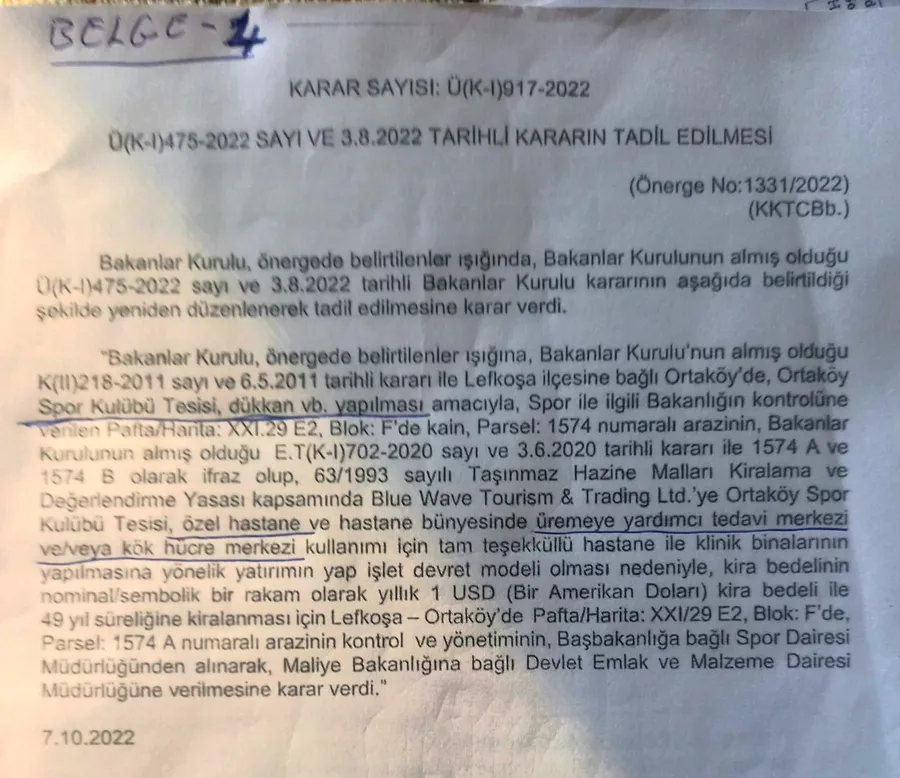 Başbakan Ünal Üstel'in isteği üzerine onaylanan önergeye göre Ü(K-I) 917-2022 sayılı ve 7 Ekim 2022 sayılı karara göre, "1574 A" Parselinin BLUE WAVE TOURİSM & TRADİNG LTD"E 49 yıllığına yılda 1 Dolara kiralanması, arazi üzerine " DÜKKAN, ÜREMEYE YARDIM VE KÖK HÜCRE MERKEZİ İNŞA EDİLMESİ" ve gerekli sözleşmenin imzalanması için hazine arazisinin Spor Dairesi Müdürlüğü’nden alınarak Devlet Emlak ve Malzeme Dairesi Müdürlüğü’ne verilmesi" kararlaştırıldı. ( BELGE : 4)