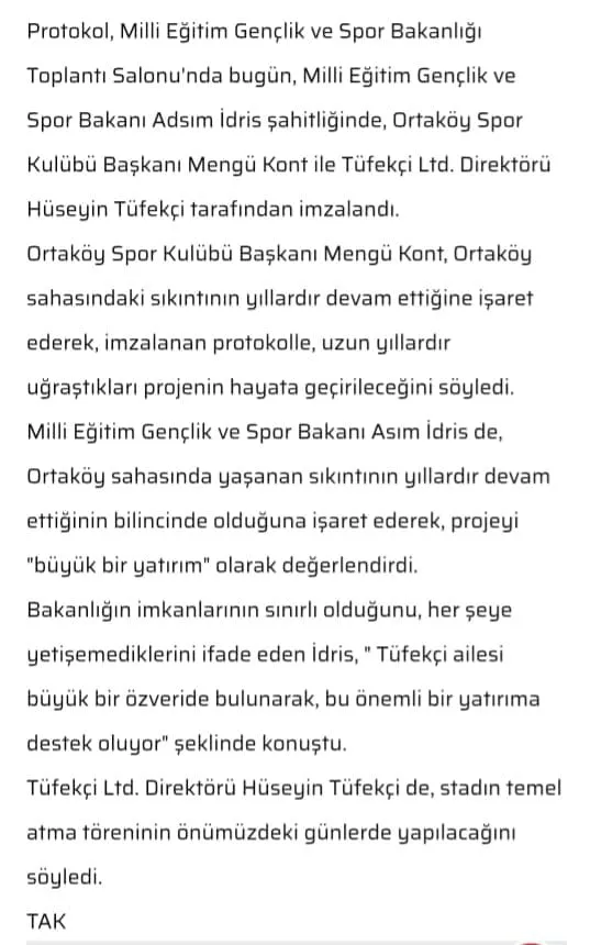 Buna göre Tüfekçi, Ortaköy Spor Kulübü kullanımındaki hazine arazisini yılda 1 dolara kiraladıktan sonra, ismini bu aşamada açıklayamayacağım özel hastahane sahibi çok değerli ve saygın bir doktorumuzla 2019 yılında görüştü.