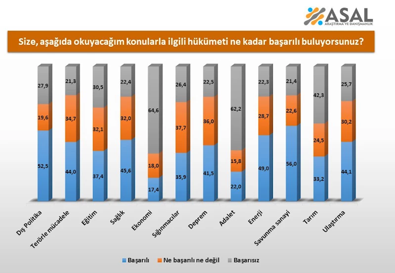 Ankette, savunma sanayisi ve dış politika dışındaki alanlara ilişkin başarı değerlendirmelerine dair oranlar paylaşılmadı. Ancak elde edilen sonuçlar, hükümetin özellikle güvenlik ve uluslararası ilişkiler alanında vatandaş nezdinde güçlü bir algıya sahip olduğunu gösteriyor.