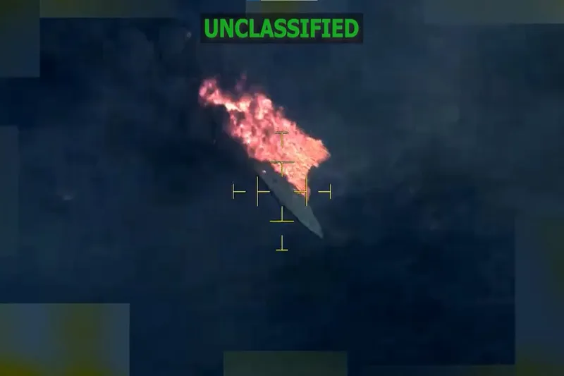 Operasyona ilişkin paylaşılan görüntülerde, teknenin vurulmasının ardından alev aldığı görülüyor.