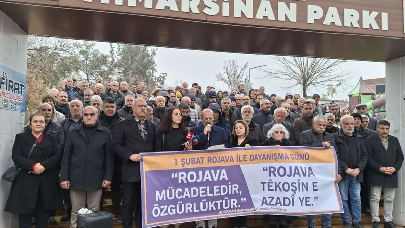 Adıyaman Demokratik Kurumlar Platformu, (DBP) 1 Şubat Dünya Rojava Günü'ne ilişkin basın açıklaması yaptı. Açıklamada, Rojava'nın Abdullah Öcalan'ın Demokratik Modernite kuramı çerçevesinde ortaya çıkan demokratik ve özgürlük temelli bir deneyim olduğunu vurgulandı. Platform adına açıklama yapan DBP Adıyaman İl Eş Başkanı Av. Hacı Kabak, "Demokratik ulusal birlik ruhuyla 1 Şubat Dünya Rojava Günü'nü selamlıyoruz. Bugün, yalnızca bir coğrafyanın kaderinin değiştiği bir günü değil; Ortadoğu'nun karanlığında halkların demokratik öz yönetim iradesiyle filizlenen 'Üçüncü Yol'un tüm dünyaya umut olduğu bir süreci selamlıyoruz" dedi.