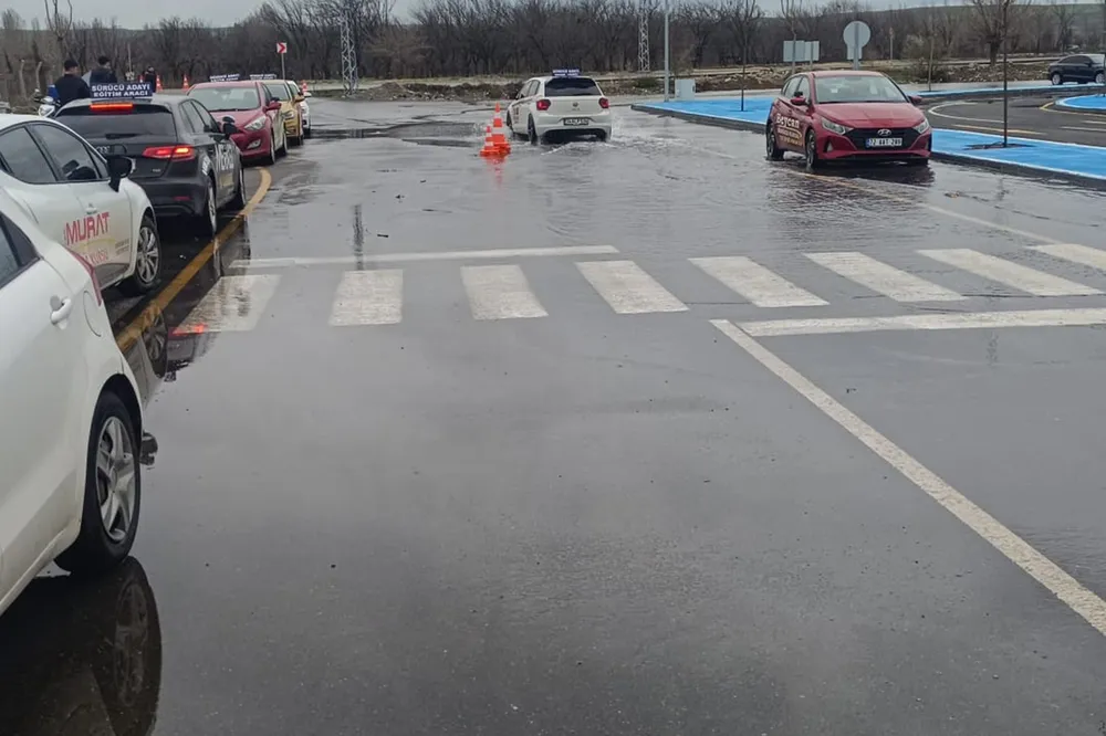 Sürücü adayları, oluşan su birikintileri nedeniyle direksiyon eğitimlerinde ciddi zorluk yaşadı. Bazı bölgelerde su seviyesinin araç kullanımını tehlikeye sokacak düzeye ulaştığı görülürken, yaşananlar cep telefonu kameralarıyla kaydedildi. Görüntülerde, eğitim pistlerinin büyük bölümünün suyla kaplandığı dikkat çekti.
