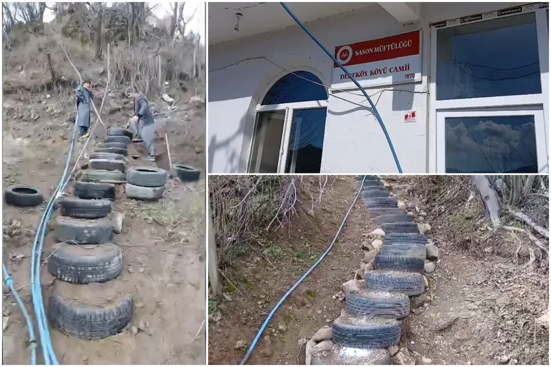 Ramazan ayında camiye ulaşmak isteyen mahalle sakinleri, araç lastiklerinden merdiven yaparak ilginç bir çözüm üretti.