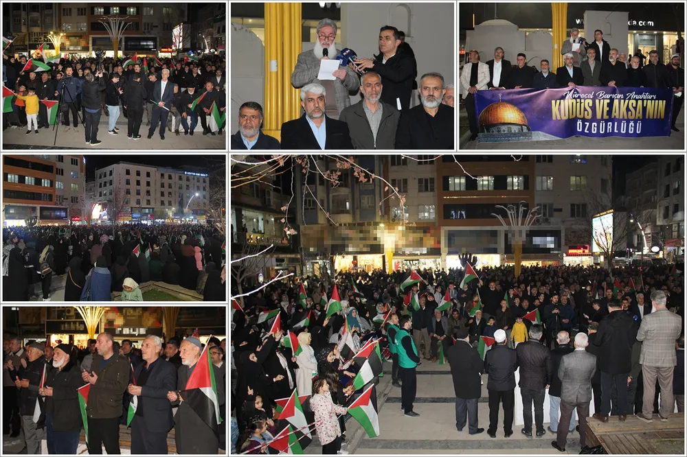 "Küresel barışın anahtarı Kudüs ve Aksa'nın özgürlüğüdür" temasıyla Gülistan Caddesi'nde teravih namazının ardından gerçekleştirilen basın açıklaması yoğun katılımla yapıldı.