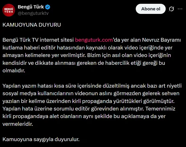 MHP lideri Devlet Bahçeli’nin Nevruz kutlamasındaki “büyük Türk coğrafyası” ifadesi, Bengü Türk’te “büyük Kürt coğrafyası” olarak servis edildi. Yanlışlık sonrası sorumlu editörün işine son verildi.