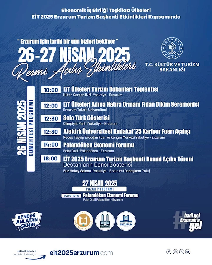 Ekonomik İş Birliği Teşkilatı Ülkeleri EİT 2025 Erzurum Turizm Başkenti Etkinlikleri Kapsamında, 26 -27 NİSAN 2025’de Erzurum için tarihi bir gün bizleri bekliyor.