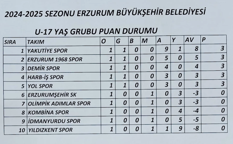 Erzurum Büyükşehir Belediyesi isim sponsorluğunda oynanan ve Futbol il temsilciliği tarafından organize edilen Erzurum Büyükşehir Belediyesi U-17 Yaş Grubunun açılış müsabakası Sultan Murat Bülbül idaresindeki İdmanyurdu Spor ile Günay Kaya Furkan Karahan ve Fetullah Elem yönetimindeki Erzurum 1968 spor 3 Temmuz stadyumunda karşı karşıya geldiler.
