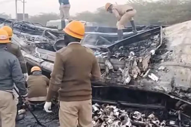 Yetkililer, bir kamyonun refüjü aşarak karşı yönden gelen yataklı yolcu otobüsüne çarptığını, çarpışmanın ardından otobüsün alev aldığını bildirdi.