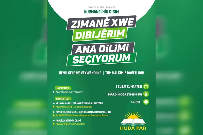 HÜDA PAR Eğitim İşleri Başkanlığı, "Ana Dilimi Seçiyorum" sloganıyla Mardin'de bir panel gerçekleştirecek. Mardin Öğretmen Evi'nde düzenlenecek olan panelde, ana dilde eğitimin önemi ve seçmeli ders sürecinde yaşanan aksaklıklar masaya yatırılacak. Panel, 7 Şubat Cumartesi günü saat 14.00'te Mardin Öğretmen Evi'nde gerçekleştirilecek.