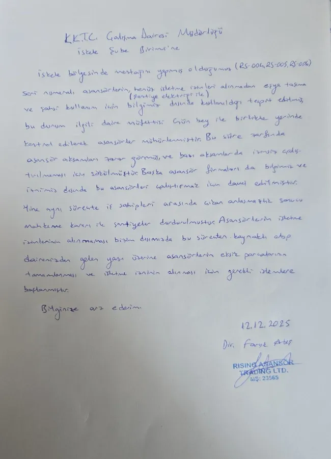 Çalışma Bakanlığı Cihaz Teftişleri Şube Amiri ise, şantiye elektriği kullanıldığını göz ardı ederek, asansör şirketine bir yazı yazdı.