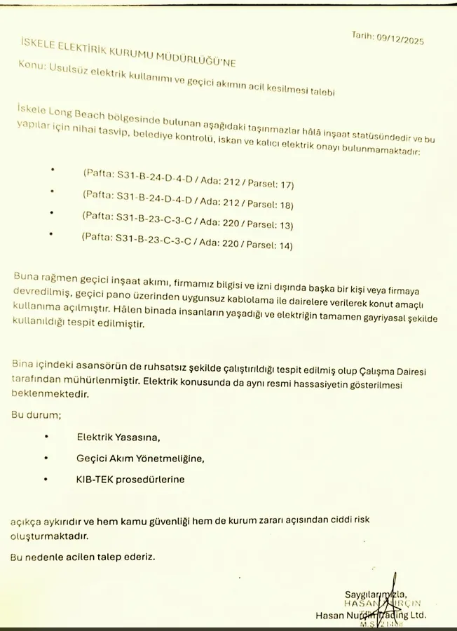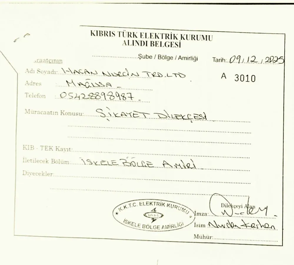 Bu durum 9 Aralık 2025'de yazılı olarak KIBTEK İskele bölge müdürlüğüne şikayet edildi.( Belge 1, belge 2)