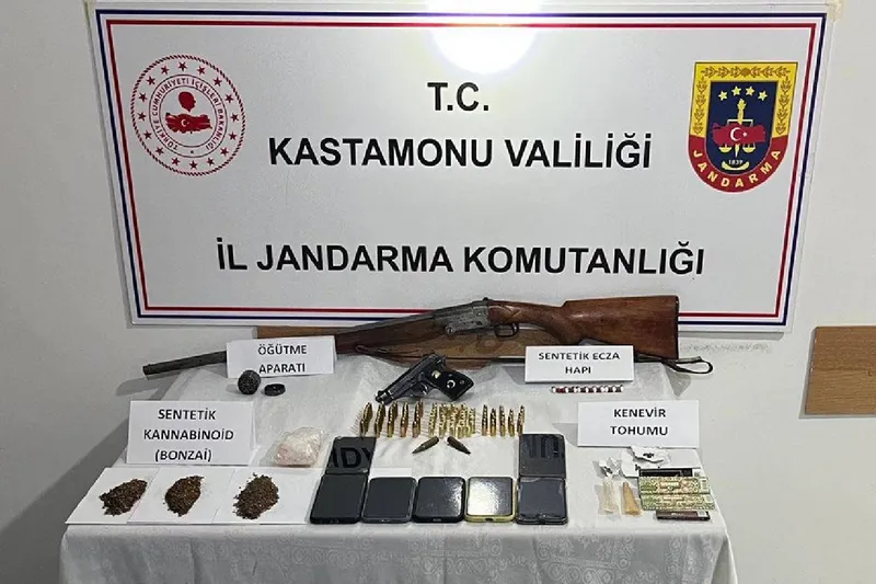 Aramalarda, 57 gram sentetik kannabinoid katkılı tütün, 18 adet sentetik ecza hapı, 3 gram kenevir tohumu, uyuşturucu madde öğütme aparatı, 19 adet kilitli poşet, 1 ruhsatsız tabanca, 70 tabanca fişeği, 1 ruhsatsız av tüfeği, 7 cep telefonu ve 7 SIM kart ele geçirildi.