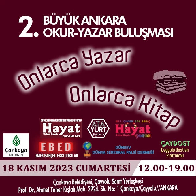 Çankaya Belediyesi'nin ev sahipliği yaptığı 2. Büyük Ankara Okur-Yazarlar buluşması 18 Kasım Cumartesi tarihinde, saat 12.00'da gerçekleştirilecek. Buluşma, saatler 19.00'ı gösterdiğinde ise sona erecek.