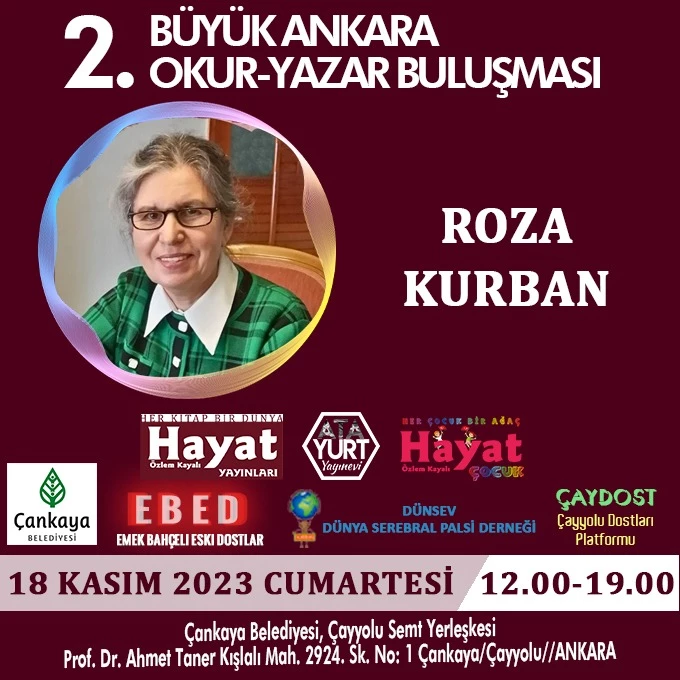 Yazar kimliğinin yanı sıra Kızılelma kadın derneği kurucusu ve başkan yardimcısı olarak tanıdığımız Roza Kurban, etkinlik kapsamında buluşmada yer alacak. Yazarı yakından takip eden okurlar ise kendisine kitap imzalatma şansı elde edecekler.