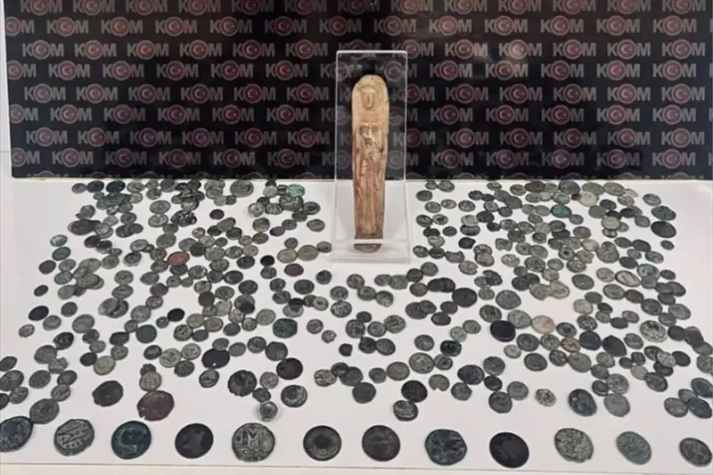 Bu kapsamda, tespit edilen adreste gerçekleştirilen aramada tarihi eser niteliğinde olduğu değerlendirilen 414 sikke ile heykel ele geçirildi.