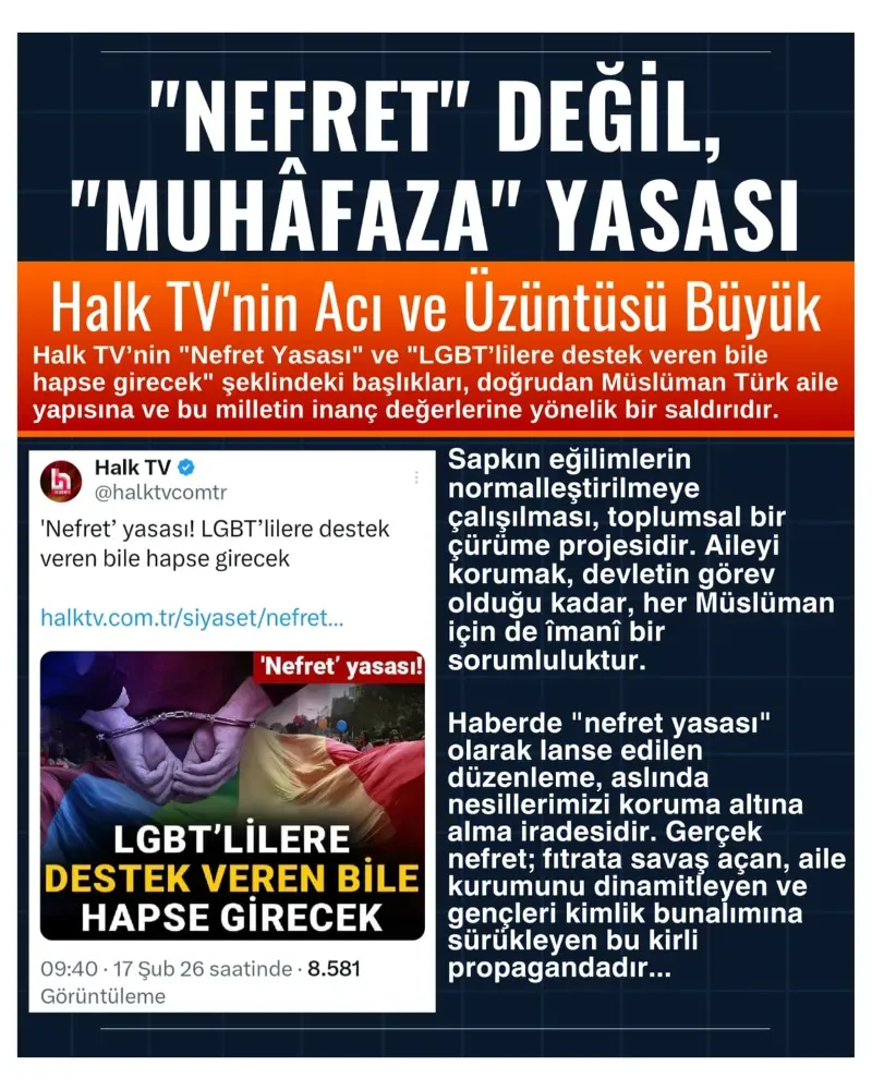 Bazı medya kuruluşlarının, Adalet Bakanlığı tarafından hazırlanan ve toplumun ahlâkî dokusunu korumayı amaçlayan yasal düzenlemeleri "nefret" kılıfı altında karalama çabasına girdiğini ibretle takip ediyoruz. Halk TV’nin "Nefret Yasası" ve "LGBT’lilere destek veren bile hapse girecek" şeklindeki başlıkları, sadece hukukî bir düzenlemeye değil, doğrudan Müslüman Türk aile yapısına ve bu milletin inanç değerlerine yönelik bir saldırıdır.