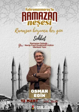 Kahramanmaraş’ta Ramazan ayının manevi atmosferi, düzenlenen kültür ve sanat etkinlikleriyle şehrin dört bir yanında hissedilmeye devam ediyor. Kahramanmaraş Büyükşehir Belediyesi, Ramazan’ın birlik, paylaşma ve maneviyat iklimini yaşatmak amacıyla gerçekleştirdiği programlara bir yenisini daha ekliyor. Bu yıl ilk kez oluşturulan Ramazan Sokağı, her akşam farklı programlarla vatandaşların buluşma noktası olmaya devam ediyor. Bu kapsamda, hafız ve yazar Osman Egin, 12 Mart Perşembe günü Kahramanmaraşlılarla buluşacak. Saat 20.30’da başlayacak söyleşide hafız Egin, Ramazan ayının manevi derinliğine yönelik değerlendirmelerde bulunacak. Egin, Kur’an-ı Kerim’den ayetler, hadisler ve ibretlik kıssalar eşliğinde Ramazan’ın insan hayatındaki önemi ele alacak; sabır, paylaşma, yardımlaşma ve manevi arınma gibi konuları da katılımcılarla paylaşacak. Büyükşehir Belediyesinden yapılan açıklamada, bu maneviyat dolu programa tüm vatandaşların davetli olduğu belirtildi.
