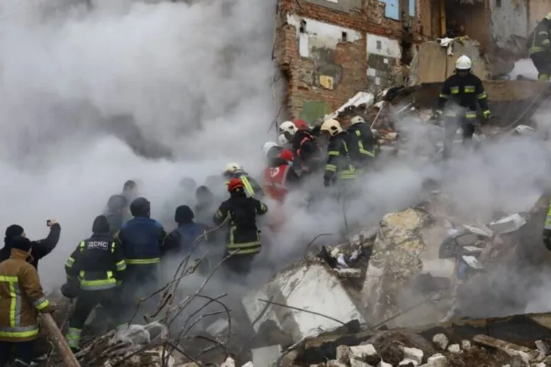 Şiddetli patlamanın ardından binada çökme meydana geldi, enkaz altında kalanlar için arama kurtarma çalışmaları devam ediyor.