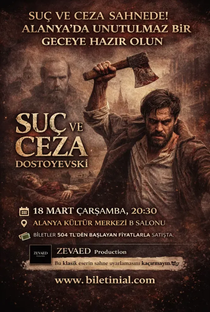 Rus edebiyatının usta kalemi Fyodor Dostoyevski’nin ölümsüz eseri, insan psikolojisinin derinliklerine inen çarpıcı hikayesiyle sahneye taşınıyor. Vicdan, suç, kefaret ve insan ruhunun karanlık tarafı… Hepsi bu güçlü uyarlamada yeniden hayat buluyor.
