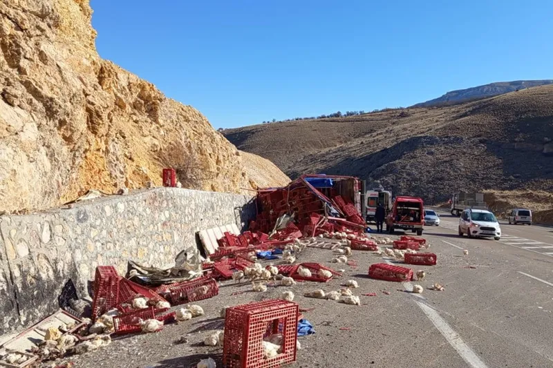 Malatya'nın Akçadağ ilçesinde sürücüsünün direksiyon hakimiyetini kaybettiği tavuk yüklü kamyon devrildi. Kazada yüzlerde tavuk telef oldu, sürücü yaralandı.