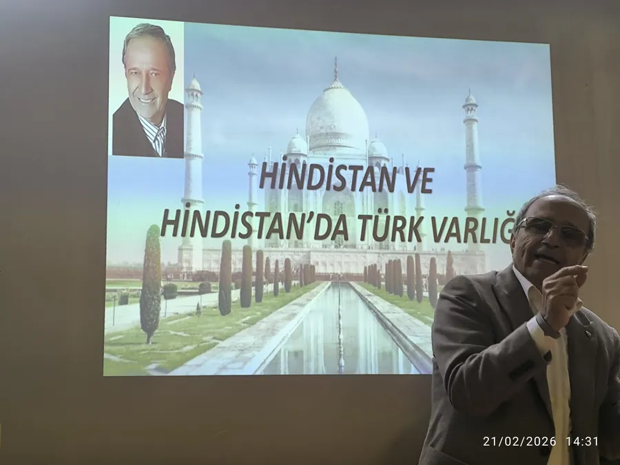 Türkolog Muharrem Yellice, sunumunda Hindistan’daki Türk varlığının tarihsel arka planını anlatarak, özellikle tarih öncesi dönemlerde Orta Asya’dan kuzey yönünden inen Sakaların Güney Asya toplumlarının ataları olduğuna ilişkin tezlere değindi. Türk kültürünün Hindistan coğrafyasındaki izlerine dikkat çeken Yellice, mimariden edebiyata kadar pek çok alanda Türk etkisinin görüldüğünü ifade etti.
