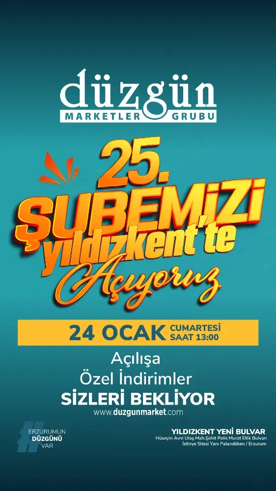 Palandöken İlçesi; Yıldızkent Yeni Bulvarda, İstinye Sitesi yanında 24 Ocak 2026 Cumartesi günü saat 13.00 da halkın hizmetine açılacak olan 25. Şubesinde özel indirimler vatandaşlarımızı bekliyor.