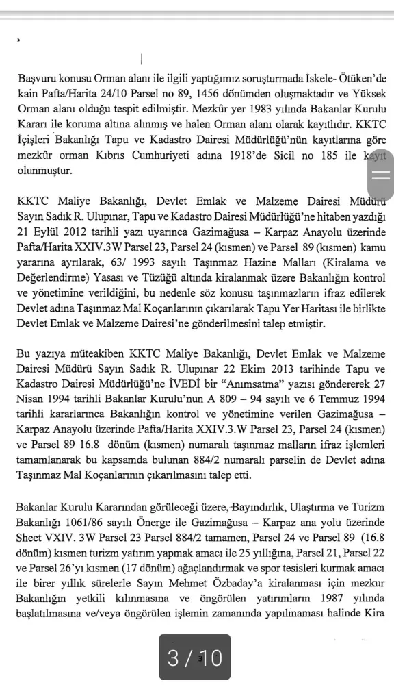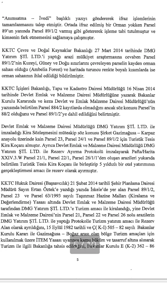 İlgili Bakanlar Kurulu Kararlarının (E(K-2)362-86), (A-809-94) ile (A-459-94) alındığı tarihlerde ve keza DMG Yatırım ŞTİ. LTD.’in KKTC Maliye Bakanlığı Devlet Emlak ve Malzeme Dairesi ile Kira Sözleşmesinin imzalandığı tarih olan 14 Mayıs 2013 tarihinde Parsel 89/1/2 diye ayrı bir taşınmaz mal yoktu veya söz konusu Ormana bir müdahale yoktu.
