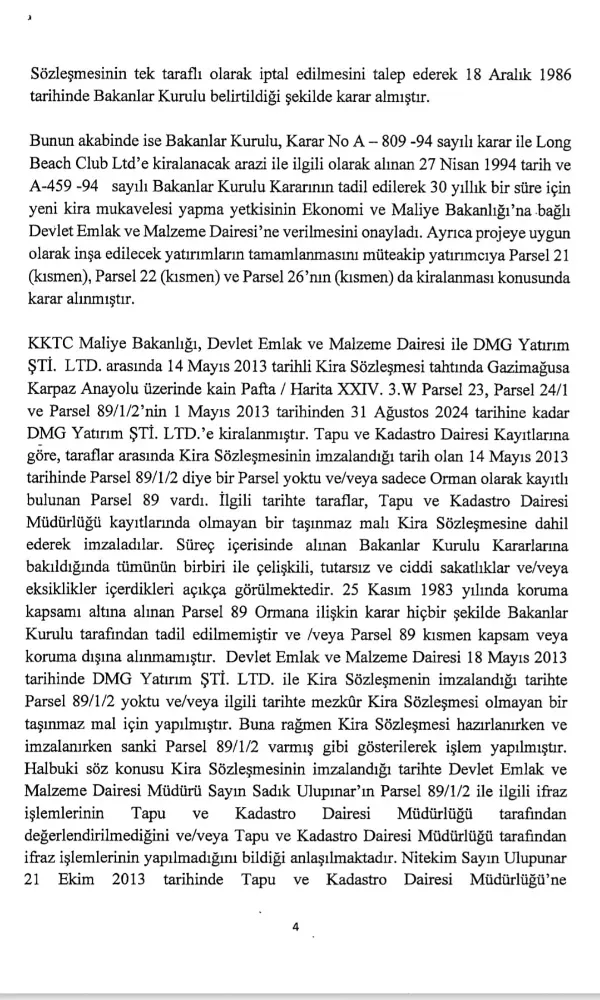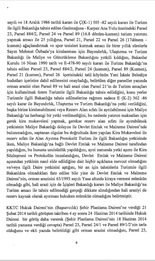 " PARSEL 89'UN VEYA PARSEL 89/1/2' NİN KİRALANMASI, VEYA REZERV OLARAK AYRILMASI VE KİRA KOÇANI VERİLMESİ VE SONRAKİ TÜM İŞLEM VE EYLEMLERİN DEVAM ETMİŞ OLMASI USÜLSÜZDÜR, HÜKÜMSÜZDÜR, KKTC ANAYASASININ İLGİLİ HÜKÜMLERİNE AYKIRIDIR"