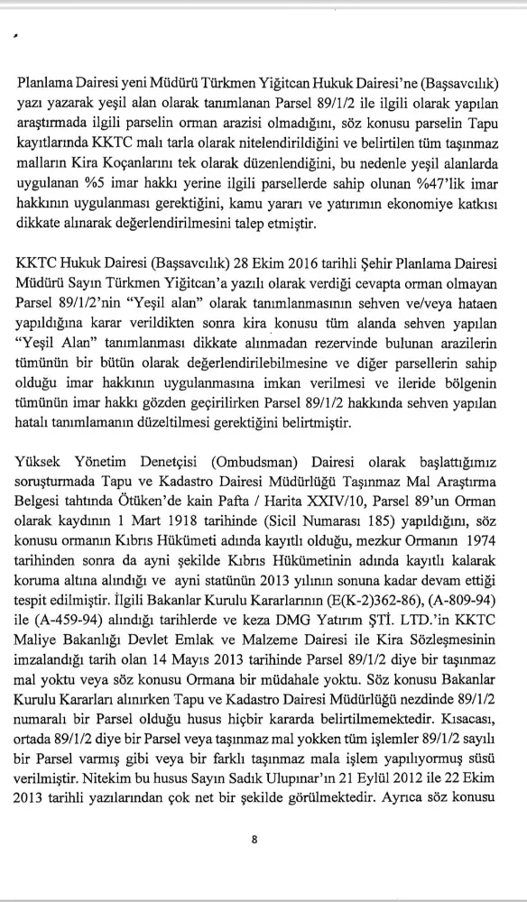 Yüksek Yönetim Denetçisi (Ombudsman) Dairesi olarak başlattığımız soruşturmada Tapu ve Kadastro Dairesi Müdürlüğü Taşınmaz Mal Araştırma Belgesi tahtında Ötüken’de kain Pafta / Harita XXIV/10, Parsel 89’un Orman olarak kaydının 1 Mart 1918 tarihinde (Sicil Numarası 185) yapıldığını, söz konusu ormanın Kıbrıs Hükümeti adına kayıtlı olduğu, mezkur Ormanın 1974 tarihinden sonra da aynı şekilde Kıbrıs Hükümetinin adına kayıtlı kalarak koruma altına alındığı ve aynı statünün 2013 yılının sonuna kadar devam ettiği tespit edilmiştir.