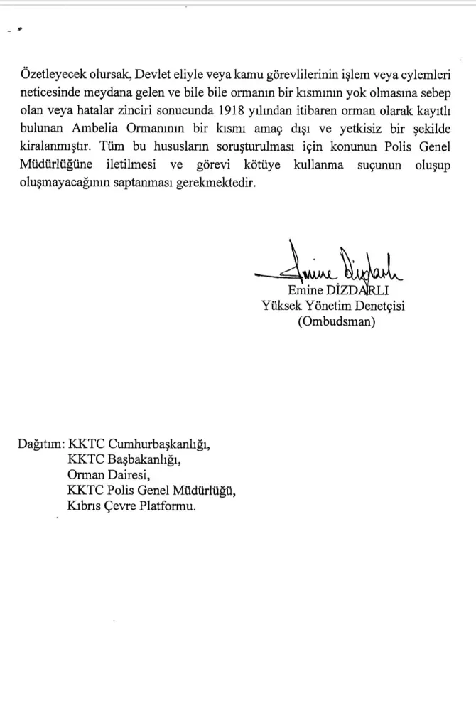 Dizdarlı'nın hazırlayıp KKTC Meclis Başkanlığı'na gönderdiği ve Cumhurbaşkanlığı, Başbakanlık, Orman Dairesi, Polis Genel Müdürlüğü'ne de dağıtım yaptığı 3 Kasım 2021 tarihli 10 sayfalık rapor, dünkü yazımda vurguladığım olguların tümünü saptamış, içeriğinde yer vermiş ve polis soruşturması gereğine işaret etmişti