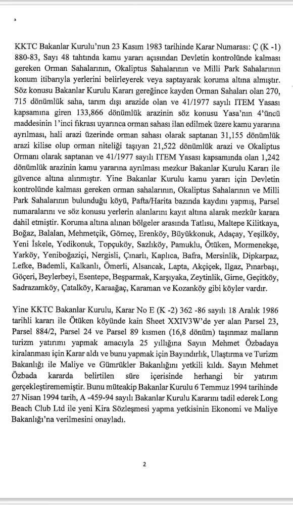 Dün yayınladığım VARAN 48'de, 1918'den beri Yüksek Orman Arazisi olarak kaydedilen Ötüken/İskele'deki 1456 dönümlük AMBELİA ORMANI'nın deniz sahilindeki 16.8 dönümlük bölümünün önce Mehmet Bada adlı kişiye 25 yıllığına peşkeş çekildiğini; 3. Uyruklu bir kişinin sahibi olduğu LONG BEACH CLUB LTD'in bu araziyi 1994'de milyonlarca sterlin ödeyerek ondan hava parası ile devraldığını, Bakanlar Kurulu kararı ile bu şirketle 30 yıllığına kira sözleşmesi imzalandığını ve 2013'de ise DMG YATIRIM ŞTİ. LTD'in yine milyonlarca sterlin hava parası ödeyerek bu araziyi LONG BEACH CLUB LTD'den devraldığını, Bakanlar Kurulu kararı ile bu şirketle 30 yıllığına yeni bir kira sözleşmesi imzalandığını anlatmıştım.