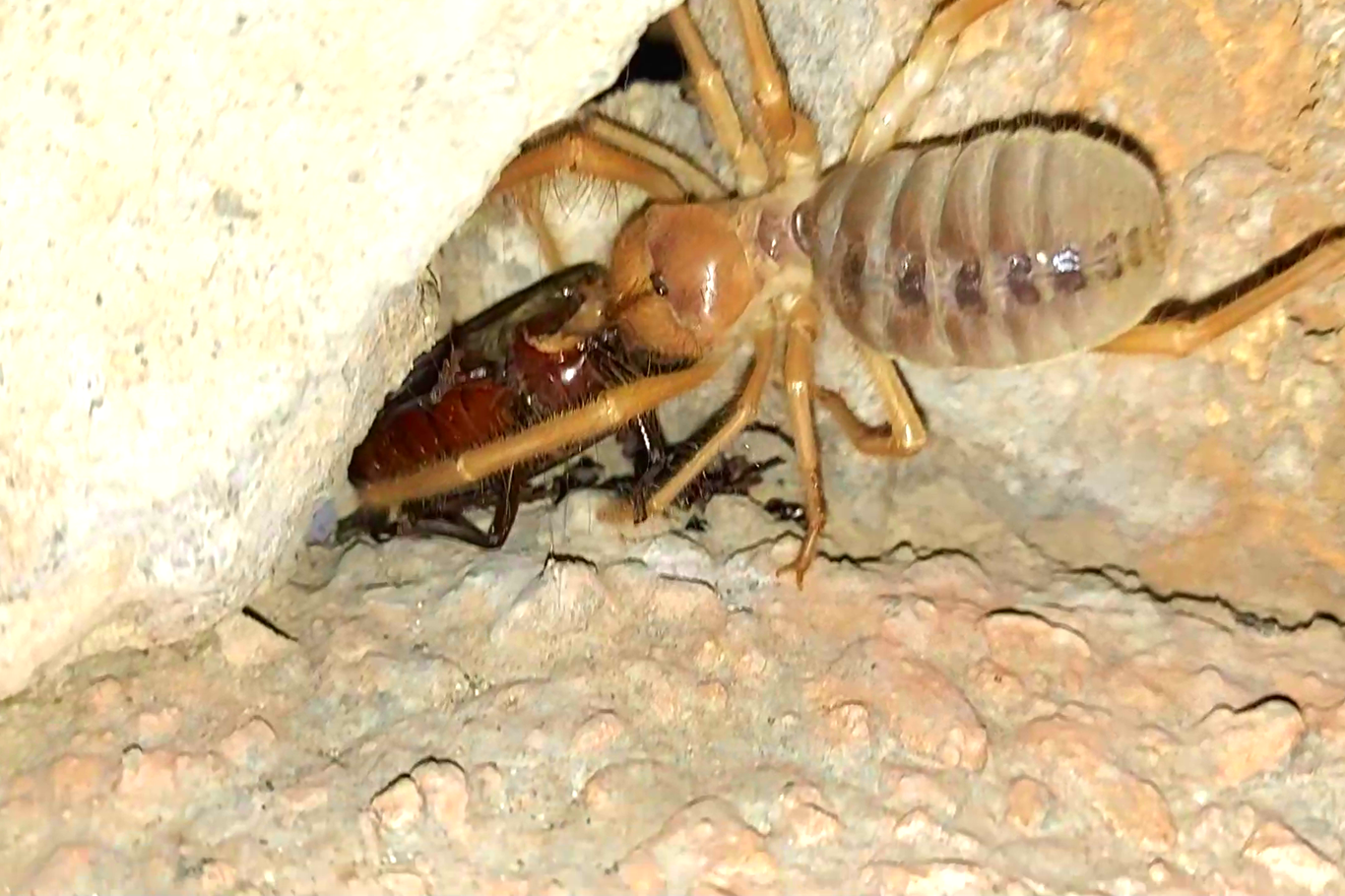Siirt'in Baykan ilçesinden  et yiyen örümcek olarak da bilinen 'sarıkız örümceği' avladığı böceği yerken görüntülendi.