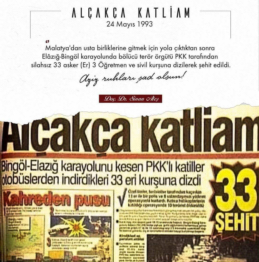 Bingöl-Elazığ karayolunda silahsız ve korumasız 33 askerin şehit edildiği saldırıyı unutmadık.