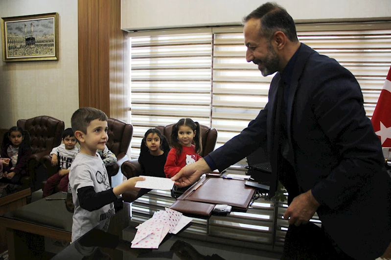 Gaziantep Şehitkamil 4-6 yaş grubunda manevi gelişim eğitimi verilen çocuklar, hazırladıkları gıda kolisi ve harçlıklarını koydukları zarflarını İlçe Müftüsü Abdullah Bekiroğlu'na teslim etti.