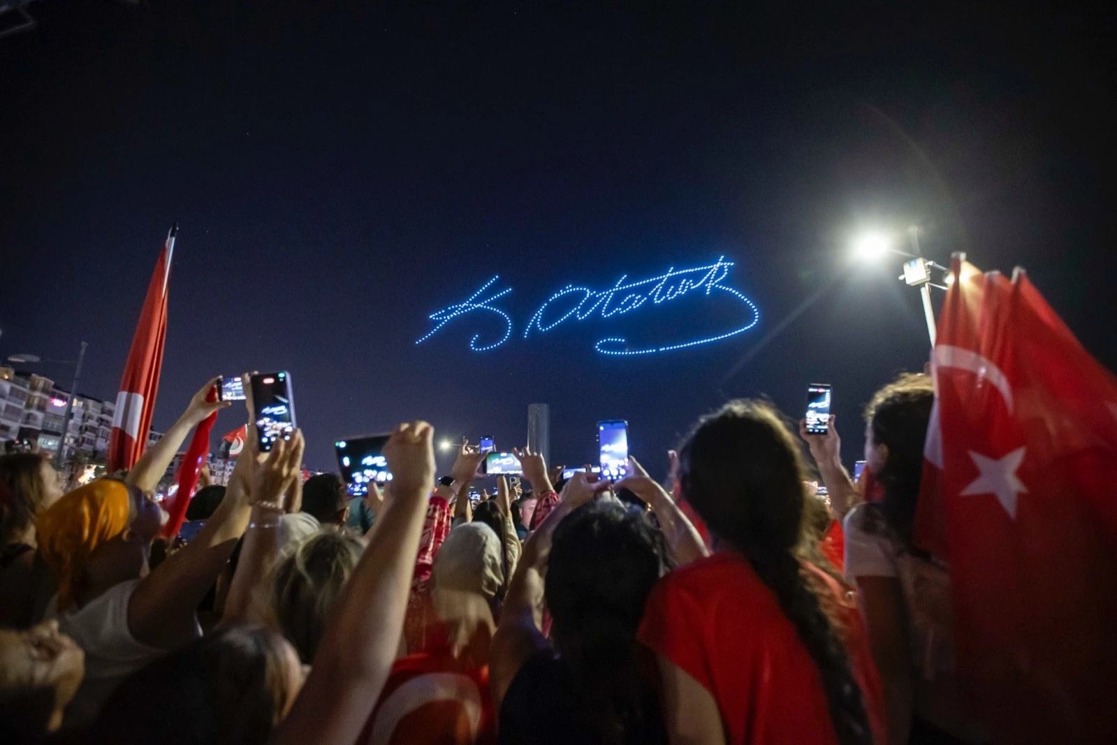 İZMİR (İGFA) - İzmir Büyükşehir Belediyesi, 30 Ağustos Zafer Bayramı kutlamaları kapsamında Gündoğdu Meydanı’nda dron gösterisi yaptı. İzmir Körfezi’nin eşsiz manzarası, 500 dronun görsel şöleni ile unutulmayacak anlara sahne oldu. İzmirli yurttaşların gösteriyi en iyi açıdan izleyebilmesi için Alsancak İskelesi’ne platform kuruldu. Çok sayıda İzmirli, ünlü oyuncu ve sunucu Yavuz Seçkin’in sunuculuğunda 30 Ağustos’u kutladı, hep bir ağızdan marşlar söyledi.