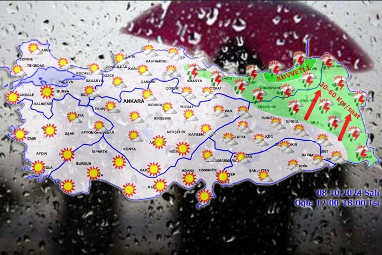 Meteoroloji 8 Ekim Salı gününe ilişkin günlük hava tahmin raporunu yayımladı. Bugün öğleden sonra Doğu Anadolu'nun kuzey ve doğusunun sağanak ve gök gürültülü sağanak yağışlı, diğer yerlerin az bulutlu ve geçmesi bekleniyor.