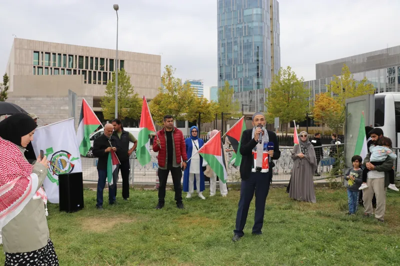 Tunus üzerinden Küresel Sumud Filosu’na katılmak üzere yola çıkan ancak geri dönmek zorunda kalan aktivistlerden Fikret Dağ, ABD Büyükelçiliği önündeki eylemde, Siyer Araştırmaları Vakfı Başkanı Muhammed Emin Yıldırım’ın gönderdiği video mesajına ilişkin bilgi verdi. Ardından Yıldırım'ın mesajı alandakilere izletildi.