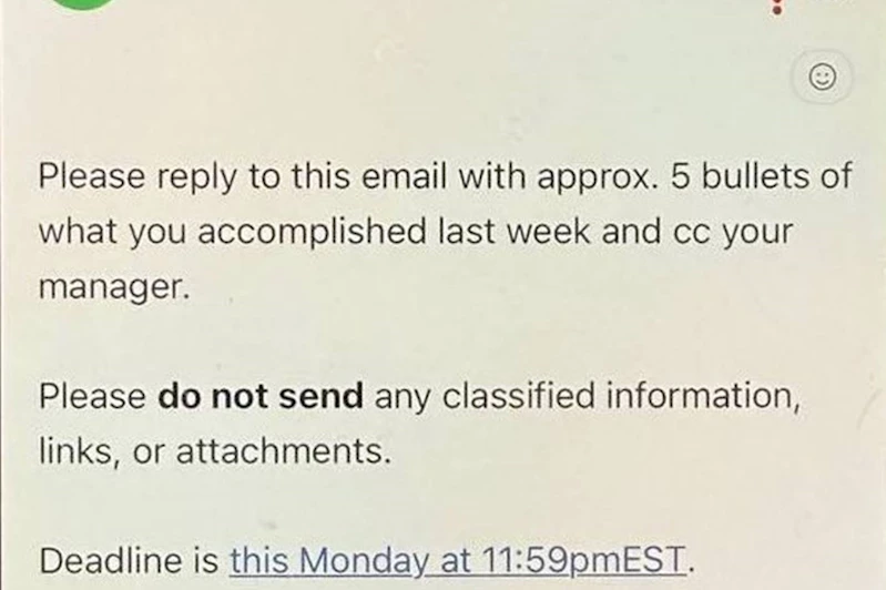 ABD federal hükümeti çalışanlarına, geçen haftaki çalışma başarılarını Pazartesi gecesine kadar özetlemeleri ya da işlerini kaybetme riskiyle karşı karşıya kalacakları yönünde bir e-posta gönderildi.